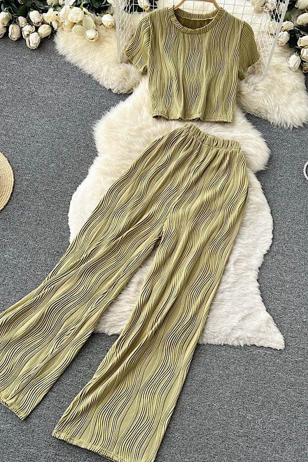 Elevate your style with this chic two-piece set. Featuring a trendy cropped top and flowy wide-leg pants, this outfit is perfect for a casual day out or a night on the town. The versatile design allows for endless styling possibilities, making it a must-have addition to your wardrobe.