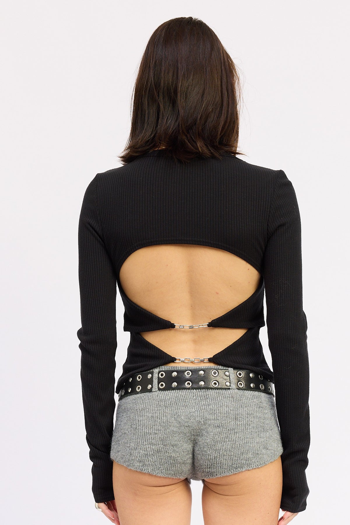 Black Long Sleeve Ribbed Top With Back Chain Detail