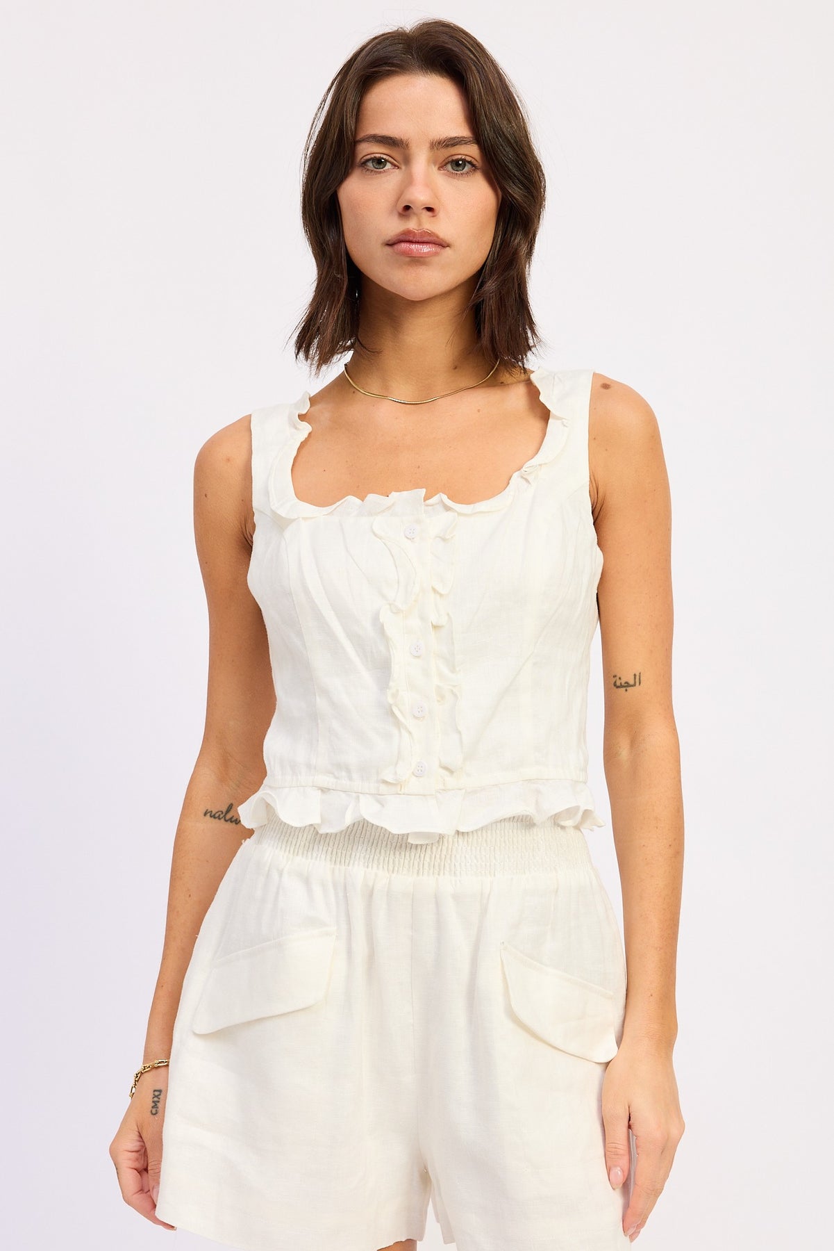 Off White Ruffled Tank With Button Front