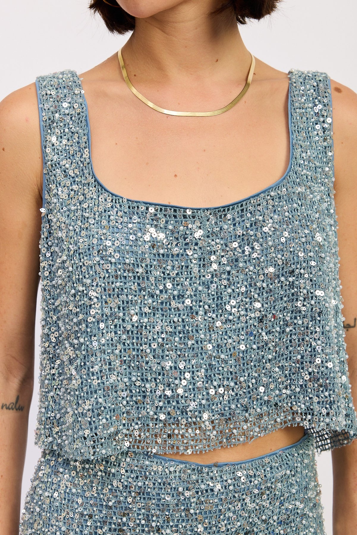 Blue Sleeveless Sqaure Neck Sequin Top