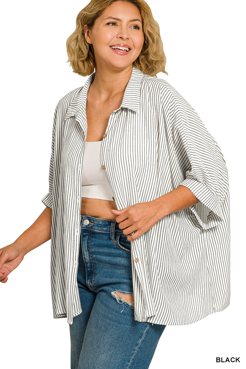 Experience the perfect blend of style and comfort with the Woven Stripe Button Down Boxy Shirt. This plus-size top is designed for the fashion-forward woman who values both functionality and elegance. The subtle striped pattern exudes sophistication, while the boxy fit offers a contemporary relaxed silhouette, making it ideal for transitioning seamlessly from casual gatherings to semi-formal events. The button-down feature ensures easy wearability, providing a chic yet effortless look.